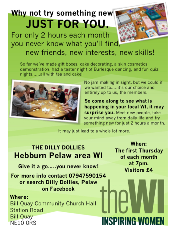 We are a relatively new WI group and would like to invite women in the Hebburn, Bill Quay, Pelaw, Wardley and Heworth area to join us. The Dilly Line ran to the staithes at Pelaw from the mines and the coal was transported in Dollies, so we are the Dilly Dollies!